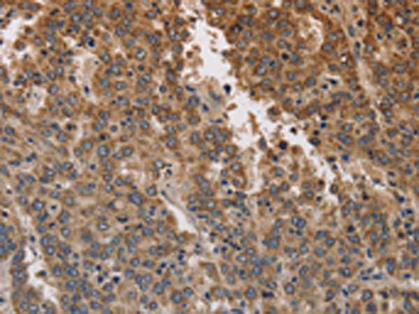 The image is immunohistochemistry of paraffin-embedded Human liver cancer tissue using P11875(KCNK9 Antibody) at dilution 1/40. (Original magnification: ×200) |