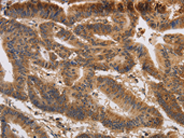 The image is immunohistochemistry of paraffin-embedded Human colon cancer tissue using P11875(KCNK9 Antibody) at dilution 1/40. (Original magnification: ×200) |