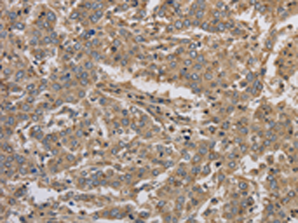 The image is immunohistochemistry of paraffin-embedded Human liver cancer tissue using P04995(KCNMB3 Antibody) at dilution 1/40. (Original magnification: ×200) |