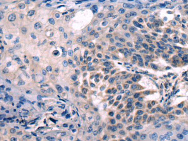 The image is immunohistochemistry of paraffin-embedded Human esophagus cancer tissue using P03495(KCTD18 Antibody) at dilution 1/70. (Original magnification: ×200) |