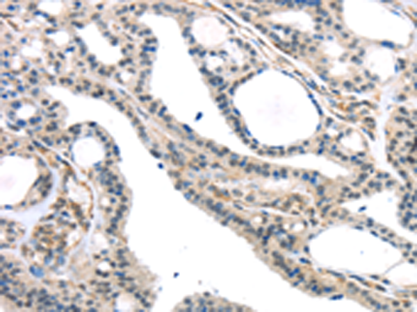 The image is immunohistochemistry of paraffin-embedded Human thyroid cancer tissue using P05486(KDM5C Antibody) at dilution 1/45. (Original magnification: ×200) |