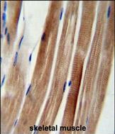 KIAA1310 Antibody (Center) (Cat. #P30839) immunohistochemistry analysis in formalin fixed and paraffin embedded human skeletal muscle followed by peroxidase conjugation of the secondary antibody and DAB staining. This data demonstrates the use of the KIAA1310 Antibody (Center) for immunohistochemistry. Clinical relevance has not been evaluated. |