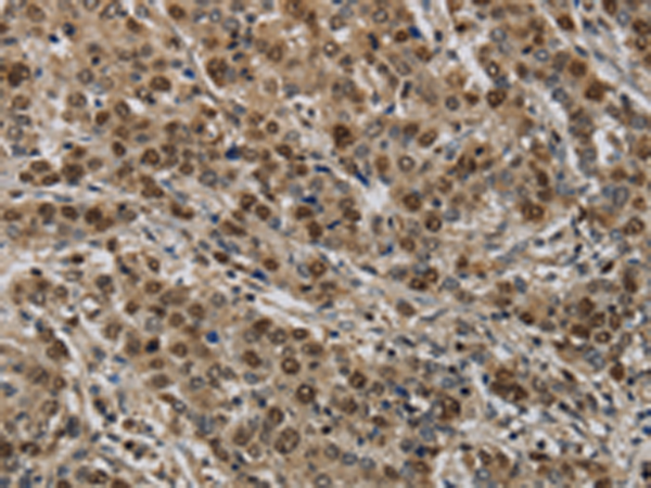 The image is immunohistochemistry of paraffin-embedded Human liver cancer tissue using P11882(KIF4A Antibody) at dilution 1/40. (Original magnification: ×200) |