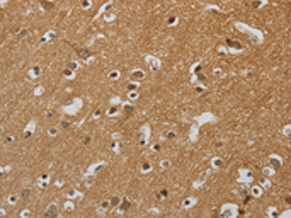 The image is immunohistochemistry of paraffin-embedded Human brain tissue using P05002(KIF4A Antibody) at dilution 1/40. (Original magnification: ×200) |