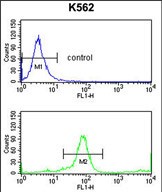 KIR3DL3 Antibody (Center) (Cat. #P30465) flow cytometry analysis of K562 cells (bottom histogram) compared to a negative control cell (top histogram).FITC-conjugated goat-anti-rabbit secondary antibodies were used for the analysis. |