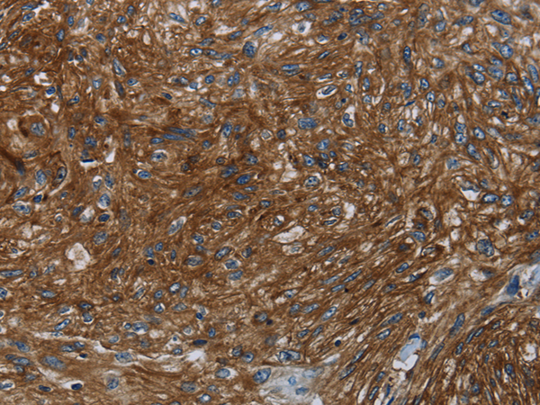 The image is immunohistochemistry of paraffin-embedded Human esophagus cancer tissue using P05004(KISS1R Antibody) at dilution 1/30. (Original magnification: ×200) |