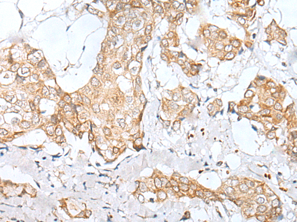 The image is immunohistochemistry of paraffin-embedded Human breast cancer tissue using P05736(KLRC2 Antibody) at dilution 1/30. (Original magnification: ×200) |