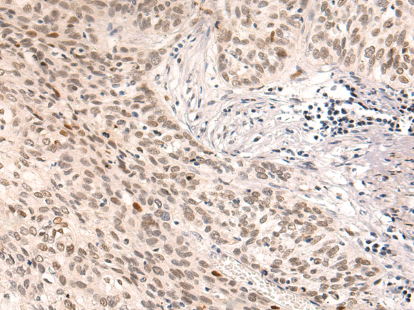 The image is immunohistochemistry of paraffin-embedded Human esophagus cancer tissue using P03591(KPNA1 Antibody) at dilution 1/50. (Original magnification: ×200) |