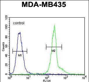 KPRA Antibody (N-term) (Cat. #P30765) flow cytometric analysis of MDA-MB435 cells (right histogram) compared to a negative control cell (left histogram).FITC-conjugated goat-anti-rabbit secondary antibodies were used for the analysis. |