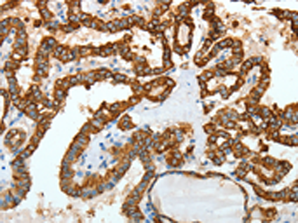 The image is immunohistochemistry of paraffin-embedded Human thyroid cancer tissue using P07086(KRT18 Antibody) at dilution 1/30. (Original magnification: ×200) |