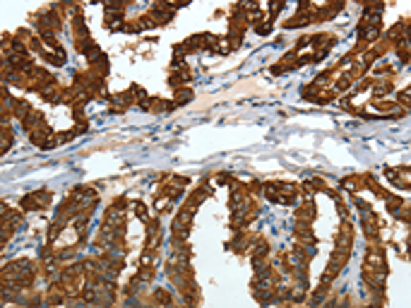 The image is immunohistochemistry of paraffin-embedded Human thyroid cancer tissue using P07065(KRT19 Antibody) at dilution 1/15. (Original magnification: ×200) |