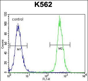 KRT25 Antibody (C-term) (Cat. #P30937) flow cytometric analysis of K562 cells (right histogram) compared to a negative control cell (left histogram).FITC-conjugated goat-anti-rabbit secondary antibodies were used for the analysis. |