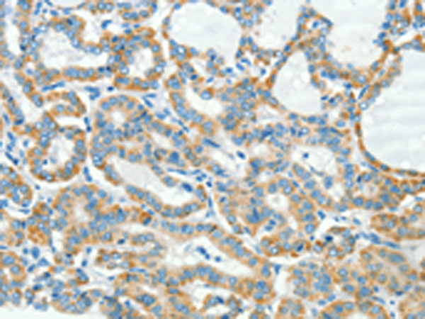The image is immunohistochemistry of paraffin-embedded Human thyroid cancer tissue using P11549(L1CAM Antibody) at dilution 1/40. (Original magnification: ×200) |