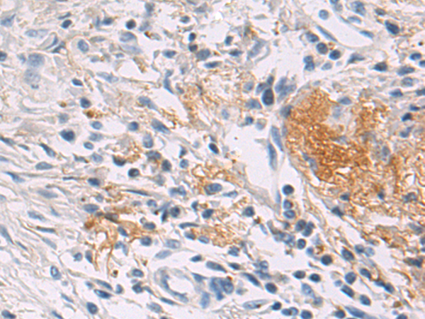 The image is immunohistochemistry of paraffin-embedded Human breast cancer tissue using P06926(LAMA2 Antibody) at dilution 1/50. (Original magnification: ×200) |