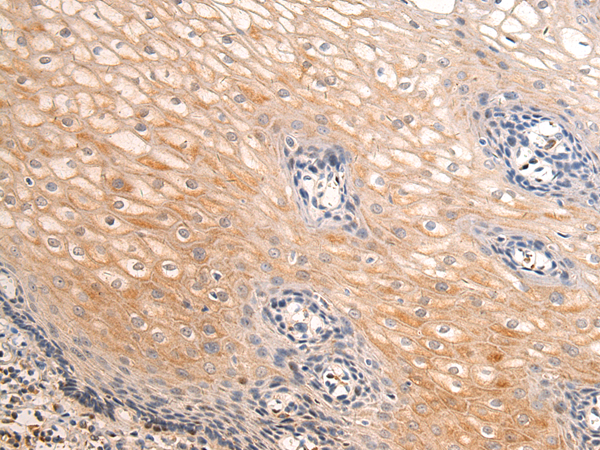 The image is immunohistochemistry of paraffin-embedded Human esophagus cancer tissue using P04068(LAYN Antibody) at dilution 1/50. (Original magnification: ×200) |