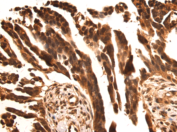 The image is immunohistochemistry of paraffin-embedded Human colorectal cancer tissue using P03573(LEO1 Antibody) at dilution 1/80. (Original magnification: ×200) |