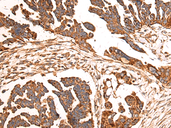 The image is immunohistochemistry of paraffin-embedded Human colorectal cancer tissue using P03580(LETM1 Antibody) at dilution 1/90. (Original magnification: ×200) |