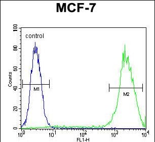 LGALS3 Antibody (C-term) (Cat. #P31016) flow cytometric analysis of MCF-7 cells (right histogram) compared to a negative control cell (left histogram).FITC-conjugated goat-anti-rabbit secondary antibodies were used for the analysis. |