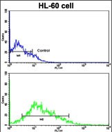 Flow cytometric analysis of HL-60 cells using LIN28B Antibody (C-term)(bottom histogram) compared to a negative control cell (top histogram). FITC-conjugated goat-anti-rabbit secondary antibodies were used for the analysis. |