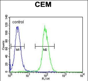 LIPC Antibody (N-term) (Cat. #P30936) flow cytometric analysis of CEM cells (right histogram) compared to a negative control cell (left histogram).FITC-conjugated goat-anti-rabbit secondary antibodies were used for the analysis. |