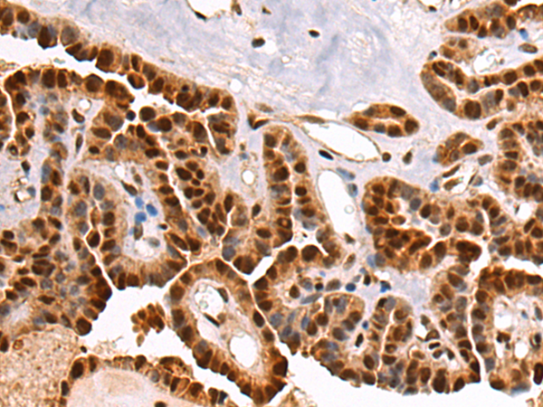 The image is immunohistochemistry of paraffin-embedded Human thyroid cancer tissue using P13719(LRP1 Antibody) at dilution 1/35. (Original magnification: ×200) |