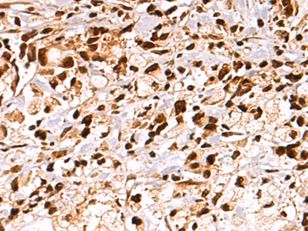 The image is immunohistochemistry of paraffin-embedded Human gastric cancer tissue using P13719(LRP1 Antibody) at dilution 1/35. (Original magnification: ×200) |