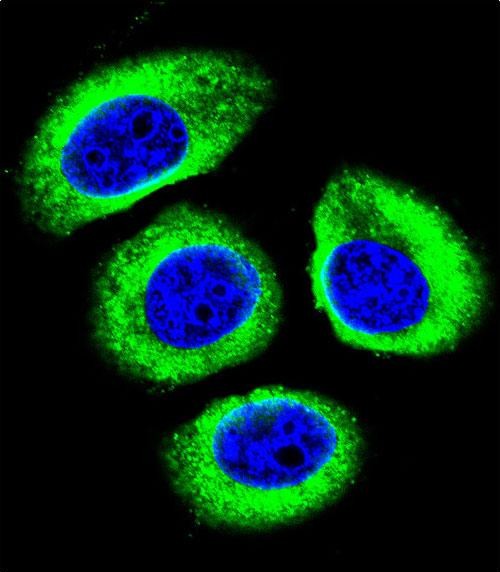 Confocal immunofluorescent analysis of LRP12 Antibody (C-term)(Cat#P32573) with U-251MG cell followed by Alexa Fluor 488-conjugated goat anti-rabbit lgG (green). DAPI was used to stain the cell nuclear (blue). |