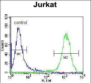 LRP12 Antibody (C-term) (Cat. #P32573) flow cytometric analysis of Jurkat cells (right histogram) compared to a negative control cell (left histogram).FITC-conjugated donkey-anti-rabbit secondary antibodies were used for the analysis. |