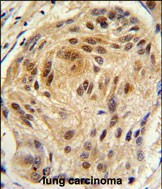 Formalin-fixed and paraffin-embedded human lung carcinoma tissue reacted with LSM1 antibody (C-term) (Cat. #P30341), which was peroxidase-conjugated to the secondary antibody, followed by DAB staining. This data demonstrates the use of this antibody for immunohistochemistry; clinical relevance has not been evaluated. |