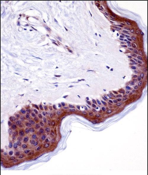 LSM14A Antibody (C-term) (P31522)immunohistochemistry analysis in formalin fixed and paraffin embedded human skin tissue followed by peroxidase conjugation of the secondary antibody and DAB staining.This data demonstrates the use of LSM14A Antibody (C-term) for immunohistochemistry. Clinical relevance has not been evaluated. |