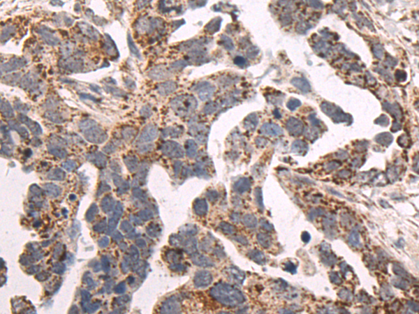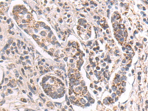 The image is immunohistochemistry of paraffin-embedded Human gastric cancer tissue using P11914(LTB4R2 Antibody) at dilution 1/50. (Original magnification: ×200) |