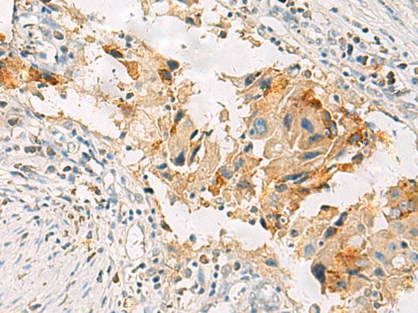 The image is immunohistochemistry of paraffin-embedded Human breast cancer tissue using P03868(LY75 Antibody) at dilution 1/35. (Original magnification: ×200) |