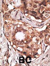 Formalin-fixed and paraffin-embedded human cancer tissue reacted with the primary antibody, which was peroxidase-conjugated to the secondary antibody, followed by DAB staining. This data demonstrates the use of this antibody for immunohistochemistry; clinical relevance has not been evaluated. BC = breast carcinoma; HC = hepatocarcinoma. |