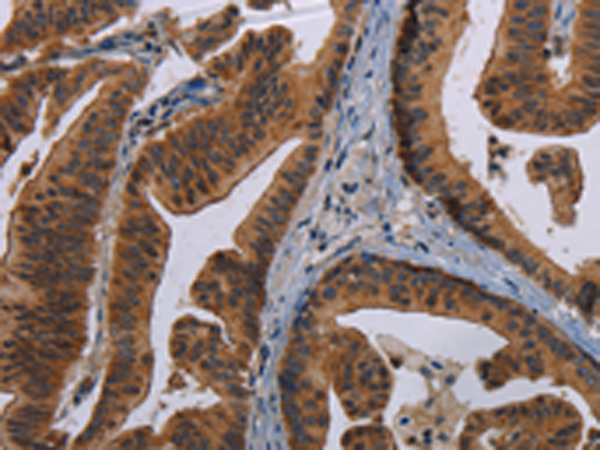 The image is immunohistochemistry of paraffin-embedded Human gastric cancer tissue using P11920(MAGEB3 Antibody) at dilution 1/20. (Original magnification: ×200) |