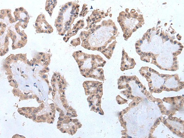 The image is immunohistochemistry of paraffin-embedded Human thyroid cancer tissue using P05932(MAGED1 Antibody) at dilution 1/20. (Original magnification: ×200) |