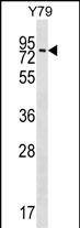 MAK Antibody (T593) (Cat. #P30036) western blot analysis in Y79 cell line lysates (35ug/lane).This demonstrates the MAK antibody detected the MAK protein (arrow). |