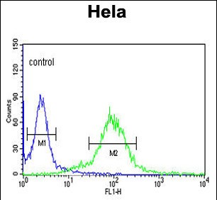 MAML3 Antibody (C-term) (Cat. #P30398) flow cytometric analysis of Hela cells (right histogram) compared to a negative control cell (left histogram).FITC-conjugated goat-anti-rabbit secondary antibodies were used for the analysis. |