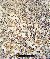 MAML3 Antibody (C-term) (Cat. #P30398) immunohistochemistry analysis in formalin fixed and paraffin embedded human lymphnode followed by peroxidase conjugation of the secondary antibody and DAB staining. This data demonstrates the use of the MAML3 Antibody (C-term) for immunohistochemistry. Clinical relevance has not been evaluated. |