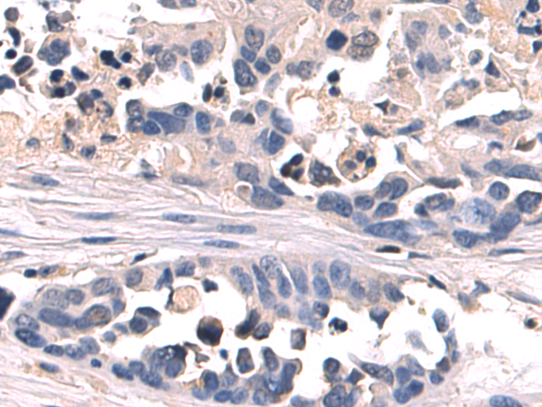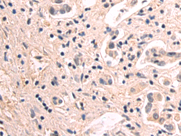 The image is immunohistochemistry of paraffin-embedded Human colorectal cancer tissue using P11949(MAP3K11 Antibody) at dilution 1/50. (Original magnification: ×200) |