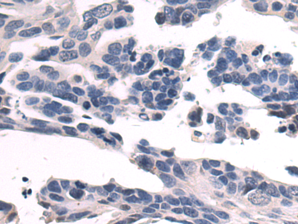 The image is immunohistochemistry of paraffin-embedded Human colorectal cancer tissue using P05059(MAP3K11 Antibody) at dilution 1/50. (Original magnification: ×200) |