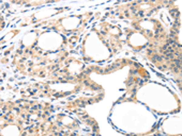 The image is immunohistochemistry of paraffin-embedded Human thyroid cancer tissue using P04092(MASP2 Antibody) at dilution 1/35. (Original magnification: ×200) |
