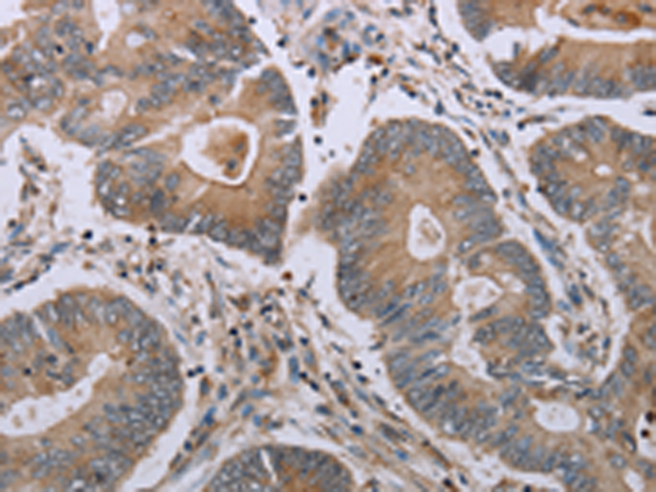 The image is immunohistochemistry of paraffin-embedded Human colon cancer tissue using P05042(MAVS Antibody) at dilution 1/20. (Original magnification: ×200) |