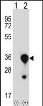 Western blot analysis of MBL2 (arrow) using rabbit polyclonal MBL2 Antibody (C-term) (Cat. #P31331). 293 cell lysates (2 ug/lane) either nontransfected (Lane 1) or transiently transfected (Lane 2) with the MBL2 gene. |