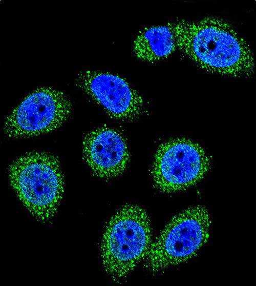 Confocal immunofluorescent analysis of MBL2 Antibody (C-term)(Cat#P31331) with A549 cell followed by Alexa Fluor 488-conjugated goat anti-rabbit lgG (green). DAPI was used to stain the cell nuclear (blue). |