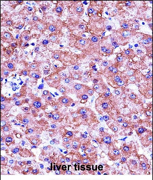 MBL2 Antibody (C-term) (Cat. #P31331)immunohistochemistry analysis in formalin fixed and paraffin embedded human liver tissue followed by peroxidase conjugation of the secondary antibody and DAB staining.This data demonstrates the use of MBL2 Antibody (C-term) for immunohistochemistry. Clinical relevance has not been evaluated. |