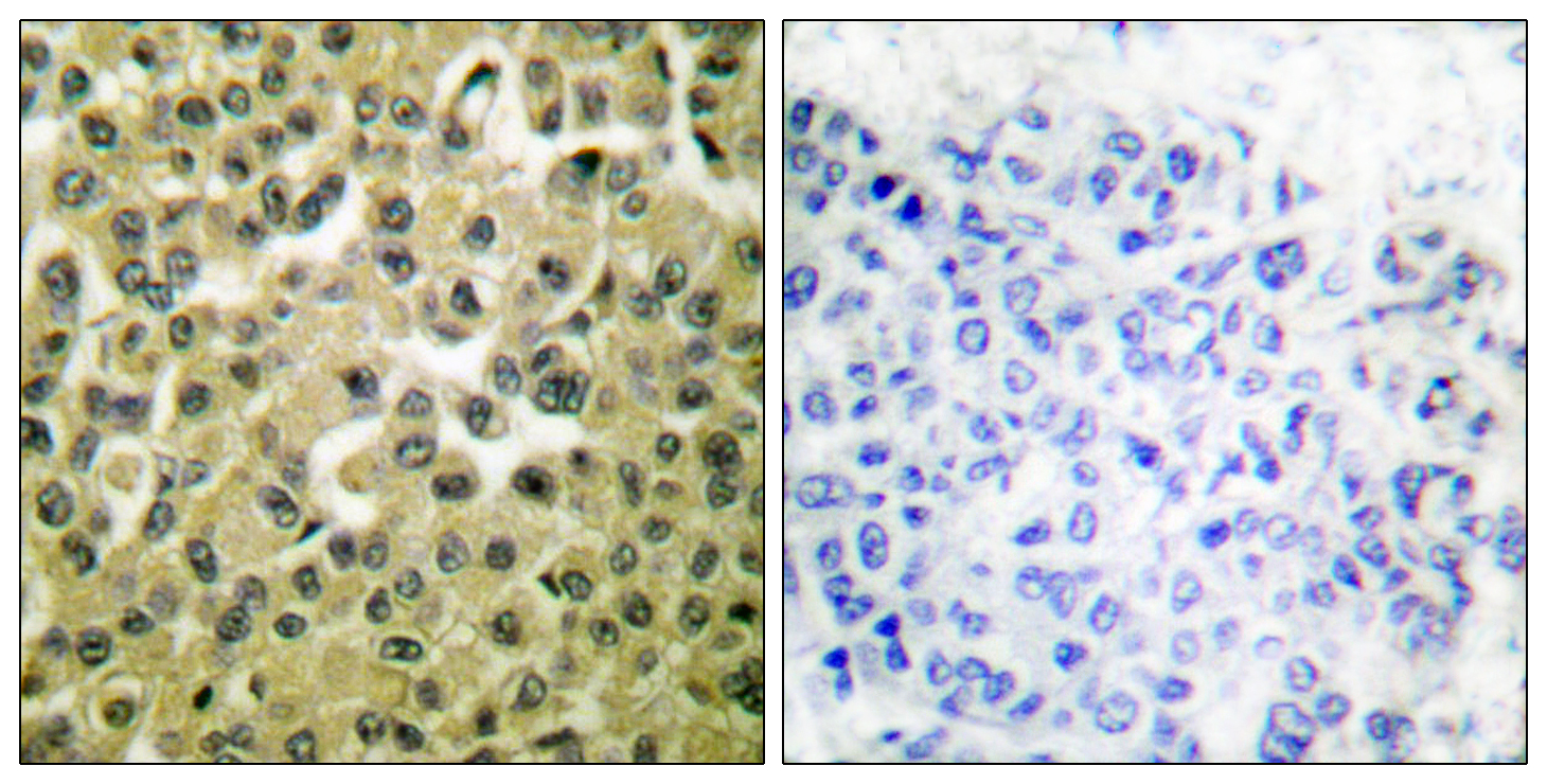 Immunohistochemistry analysis of paraffin-embedded Human breast carcinoma tissue using MCL1 antibody. High-pressure and temperature Sodium Citrate pH 6.0 was used for antigen retrieval. Sample with blocking peptide on the right. |
