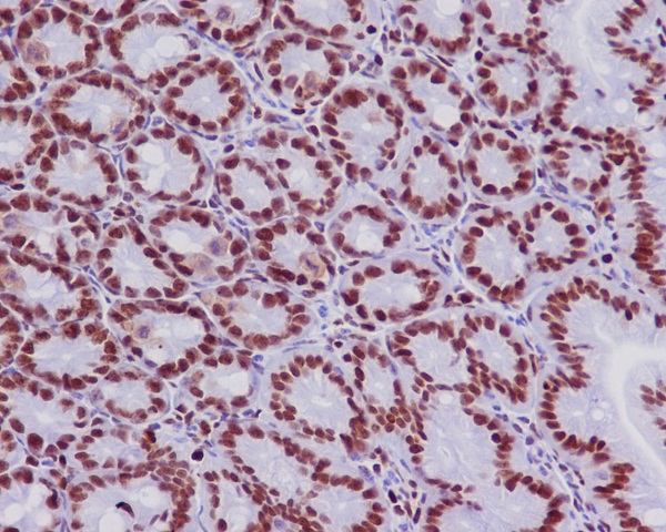 Immunohistochemistry analysis of paraffin-embedded mouse colon using MCM2 antibody.High-pressure and temperature Sodium Citrate pH 6.0 was used for antigen retrieval. |