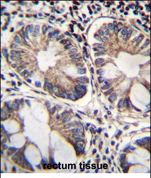 ME2 Antibody (C-term) (Cat. #P31116)immunohistochemistry analysis in formalin fixed and paraffin embedded human rectum tissue followed by peroxidase conjugation of the secondary antibody and DAB staining.This data demonstrates the use of ME2 Antibody (C-term) for immunohistochemistry. Clinical relevance has not been evaluated. |