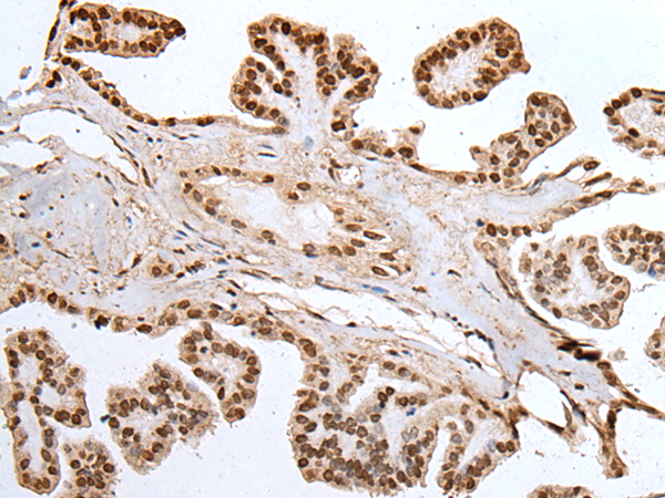 The image is immunohistochemistry of paraffin-embedded Human thyroid cancer tissue using P12783(MEF2D Antibody) at dilution 1/20. (Original magnification: ×200) |