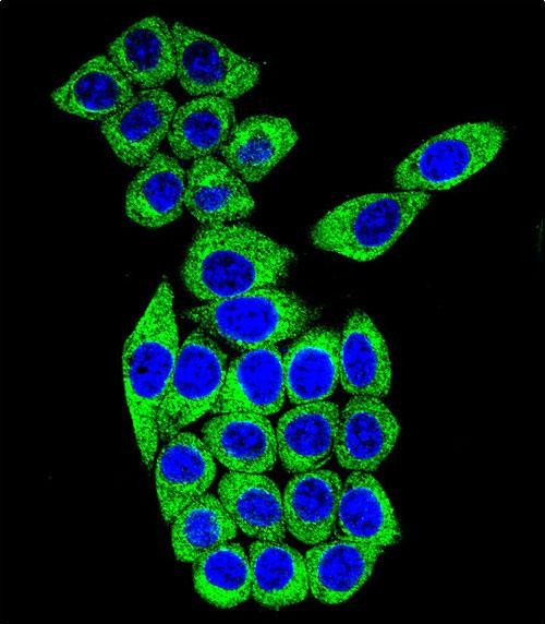 Confocal immunofluorescent analysis of MESDC2 Antibody (C-term)(Cat#P32571) with 293 cell followed by Alexa Fluor® 488-conjugated goat anti-rabbit lgG (green). DAPI was used to stain the cell nuclear (blue). |